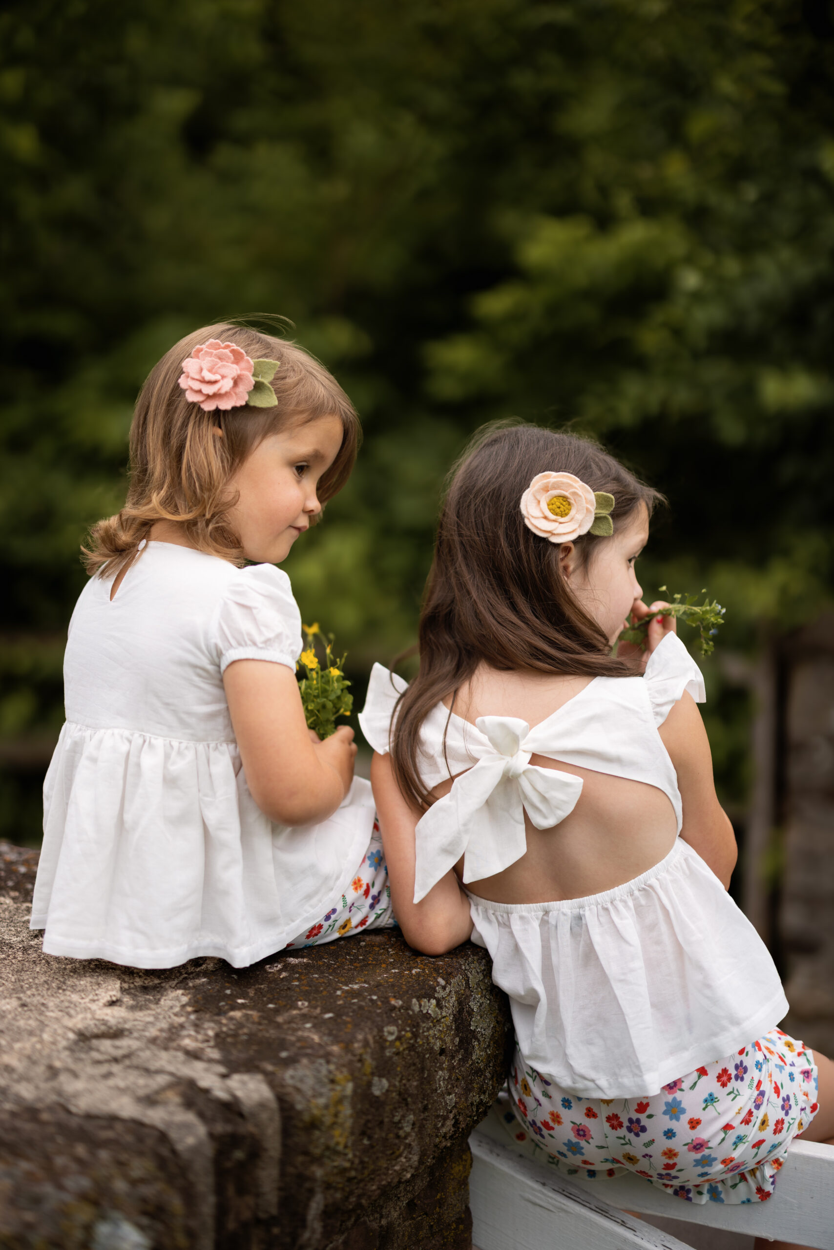 The sleeveless design with cute ruffle details and gentle gathers below the bodice gives it a relaxed, feminine shape. A tie at the back and an elastic waistband at the back make it easy to wear and move in.