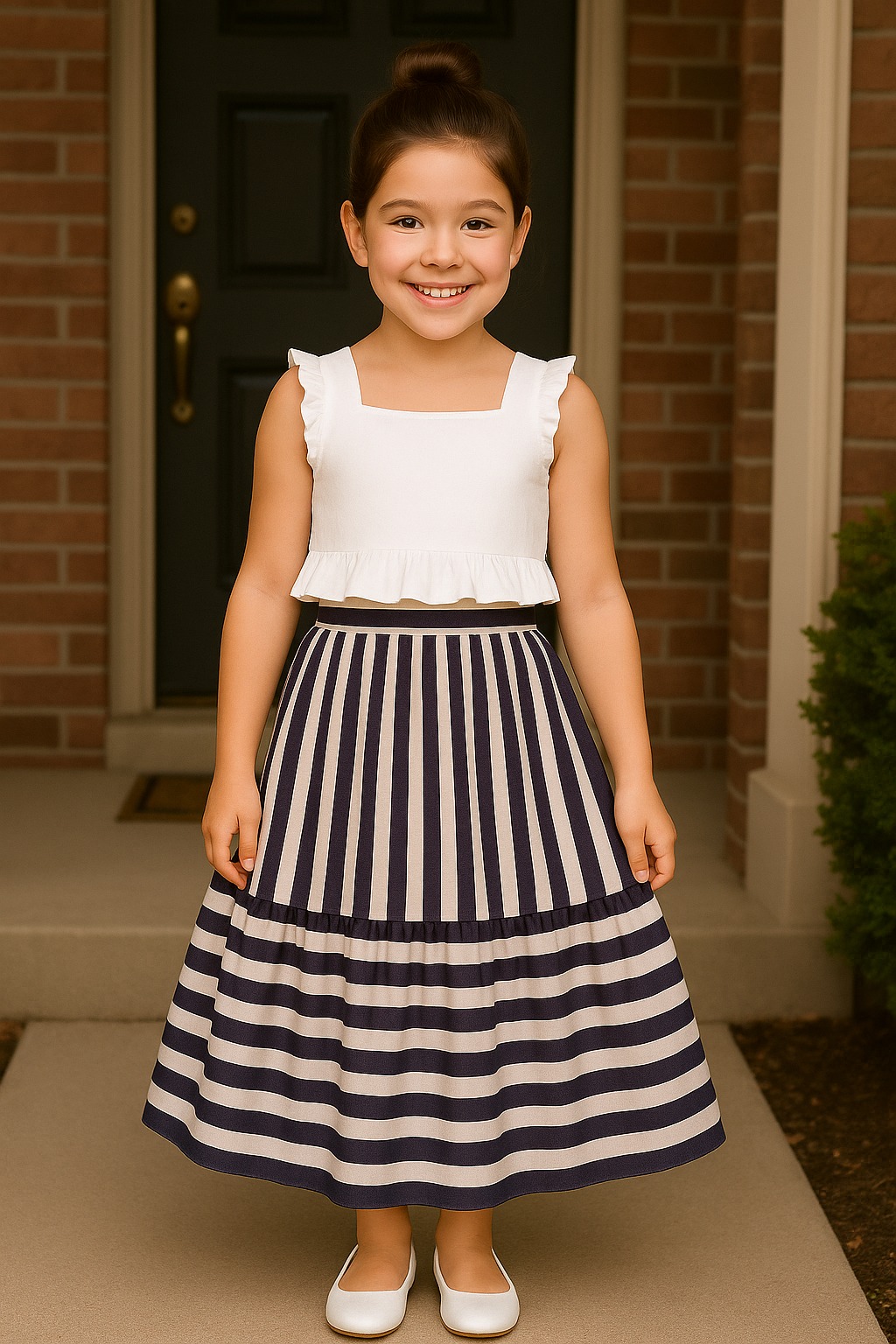 Crafted from soft cotton sateen fabric, this skirt features a two-layered structure that adds volume and elegance. It showcases both vertical and horizontal stripe detailing for a refined look. The front waistband is flat, while the back is elasticated for a comfortable fit. A timeless piece that effortlessly transitions from everyday outings to more special occasions.