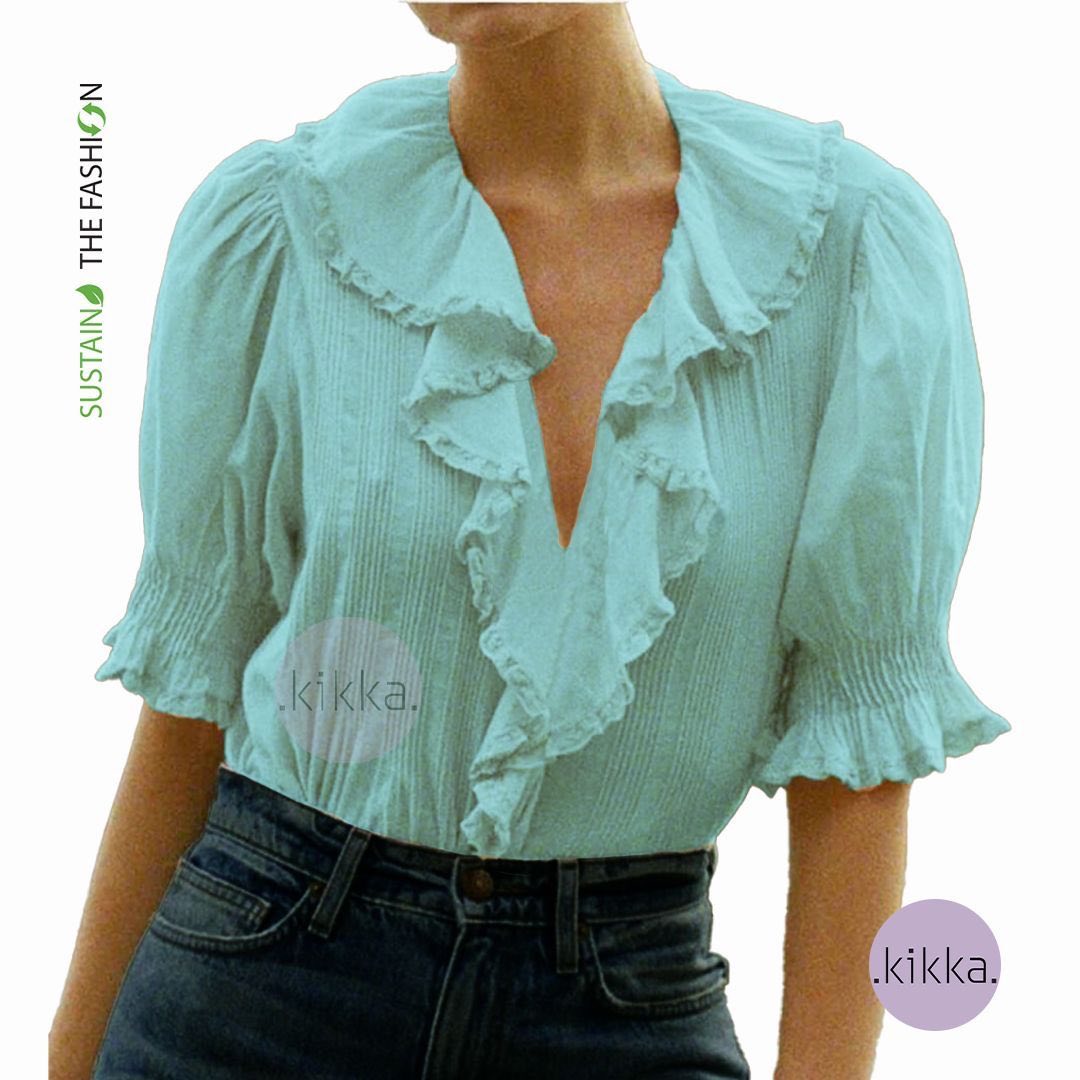 Stylish casual and chic shirt made of organic fabric with collar ruffles,front button closure and ruffles.