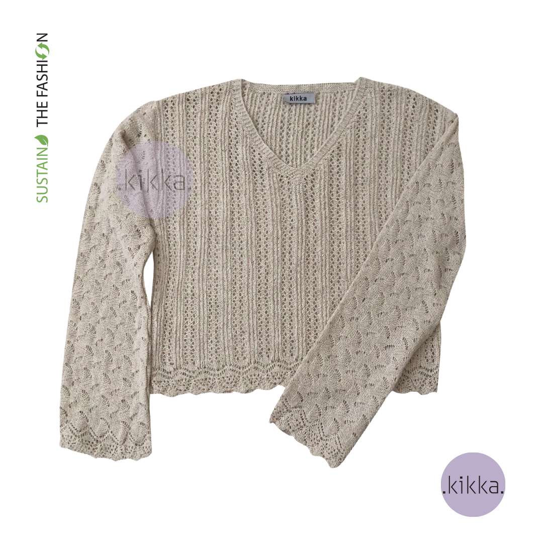 The V-neck and long sleeves create a flattering shape, while the scalloped hems on the sleeves and body add a subtle feminine detail. Ideal for layering or wearing on its own, this sweater is practical and timeless.